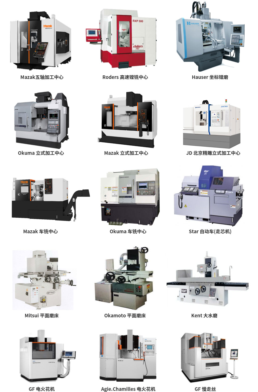 在精密零部件業(yè)務(wù)領(lǐng)域,公司技術(shù)擁有400多臺精密機械加工設(shè)備,擁有車、銑、磨、鏜、CNC、電火花、線切割以及模具、夾具裝配等全工序高精度加工能力,在線切割、電火花、鏜磨、平面磨等工種的加工精度可達(dá)到正負(fù)3μ以內(nèi)。支持鎢鋼、高速鋼、不銹鋼、鋁合金、工程塑料、碳鋼等各種材料的加工。